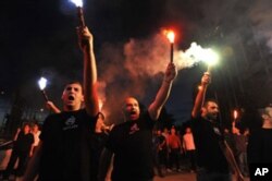 “Gretsiya greklar uchun” degan shiorlarni ko’tarib, “Oltin Tong” partiyasi tarafdorlari Afina ko’chalarini kezmoqda.